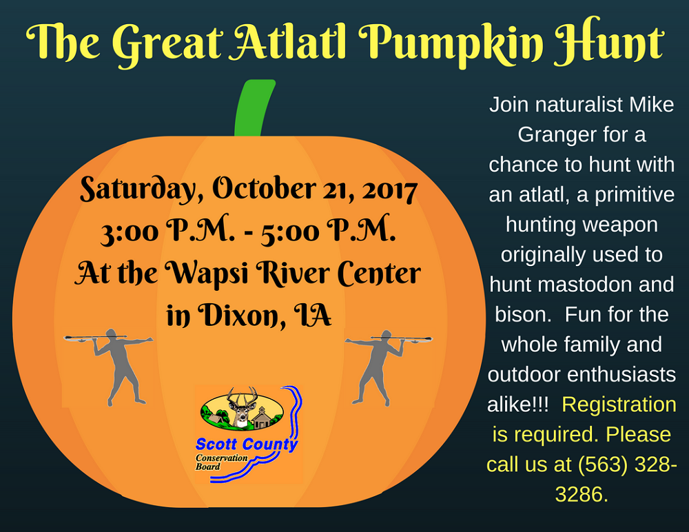 Join naturalist Michael J. Granger for a chance to hunt with an atlatl, a primitive hunting weapon originally used to hunt mastodon and bison. Large target pumpkins and real pumpkins will be set out as targets. Fun for the whole family and outdoor enthusiasts alike!!! Please call to pre-register.