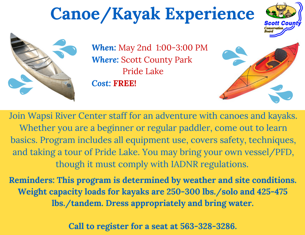 Join Director/Naturalist Dave Murcia for an adventure with canoes and kayaks. Whether you are a beginner or regular paddler, come out to learn basics. Program includes all equipment use, covers safety, techniques, and taking a tour of Pride Lake. You may bring your own vessel/PFD, though it must comply with IADNR regulations. Reminder - this program is determined by weather and site conditions, weight capacity loads are 250-300 lbs./solo and 425-475 lbs./ tandem. Dress appropriately and bring water