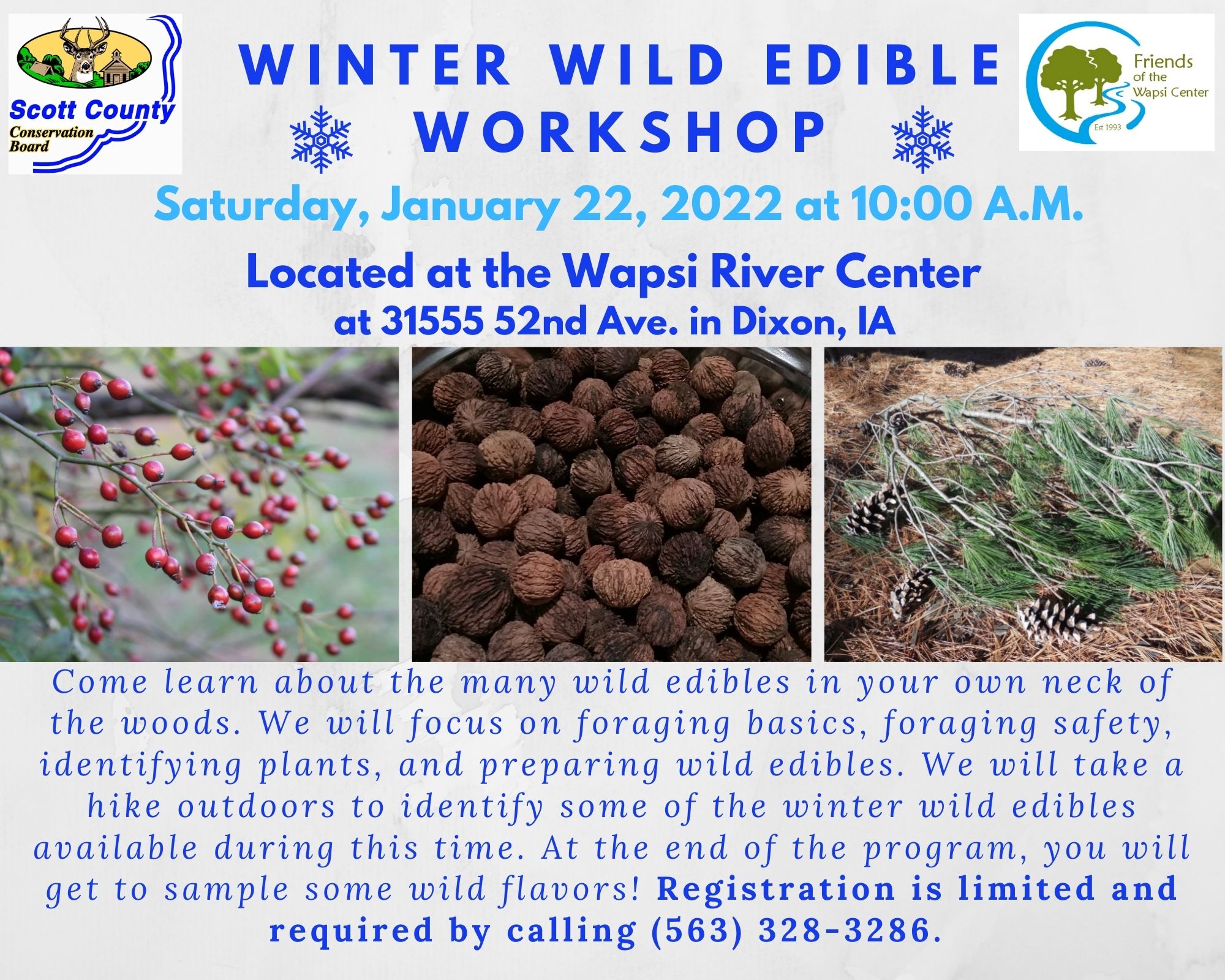 Come learn about the many wild edibles in your own neck of the woods. We will focus on foraging basics, foraging safety, identifying plants and preparing wild edibles. We will take a hike outdoors to identify some of the winter wild edibles available during this time. At the end of the program, you will get to sample some wild flavors!  Registration is limited and required, please call to register.