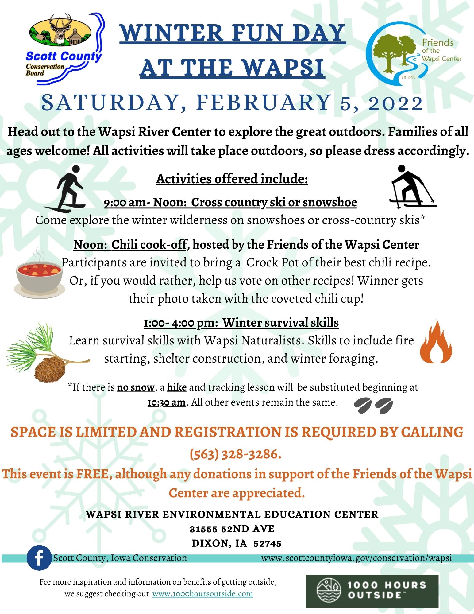 Head out to the Wapsi Center to spend some time outside. Families of all ages welcome! All activities will take place outdoors, so please dress accordingly Please call to register your family 563-328-3286.