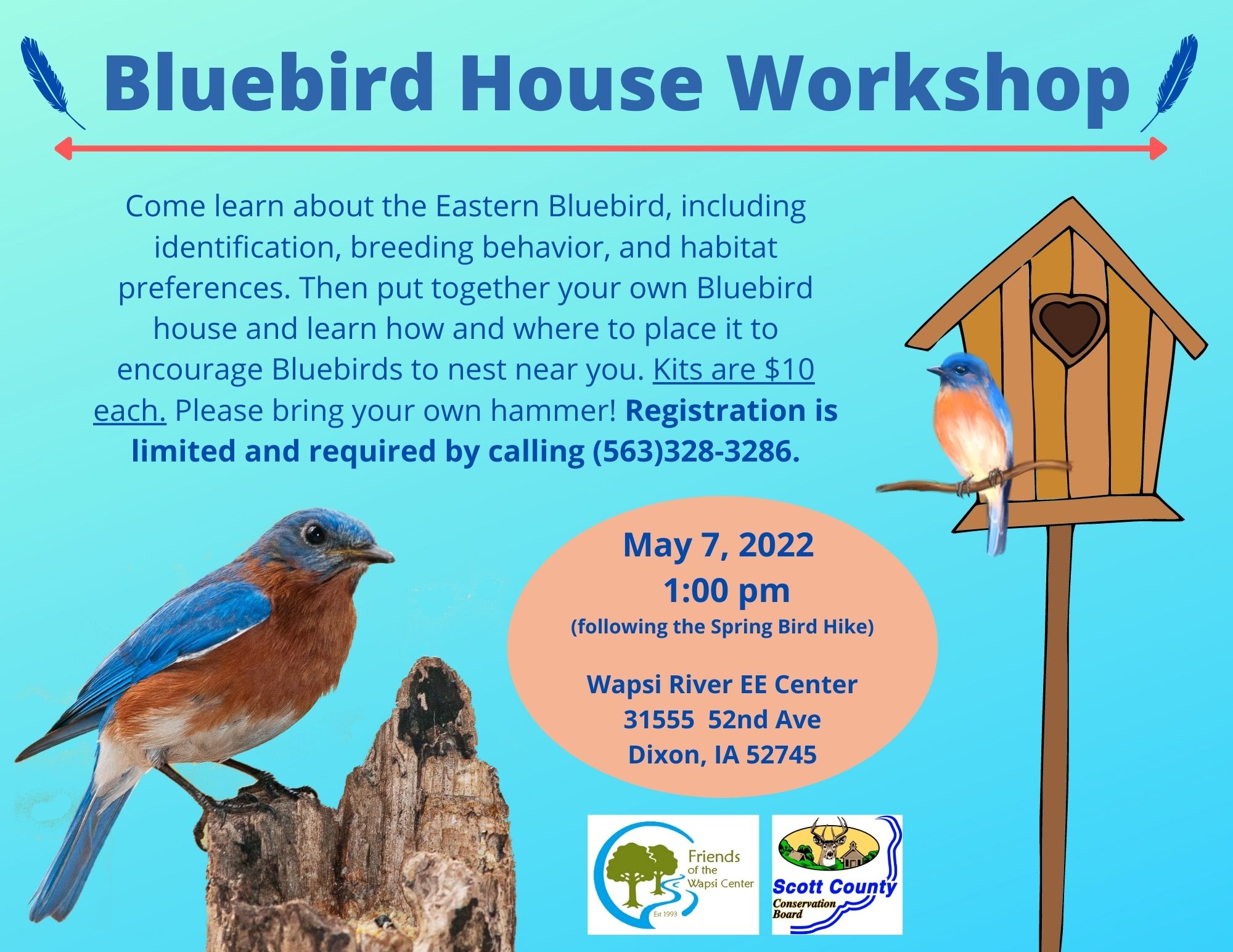 Come learn about the Eastern Bluebird, including identification, breeding behavior, and habitat preferences. Then put together your own Bluebird house and learn how and where to place it to encourage Bluebirds to nest near you. Kits are $10 each. Please bring your own hammer!