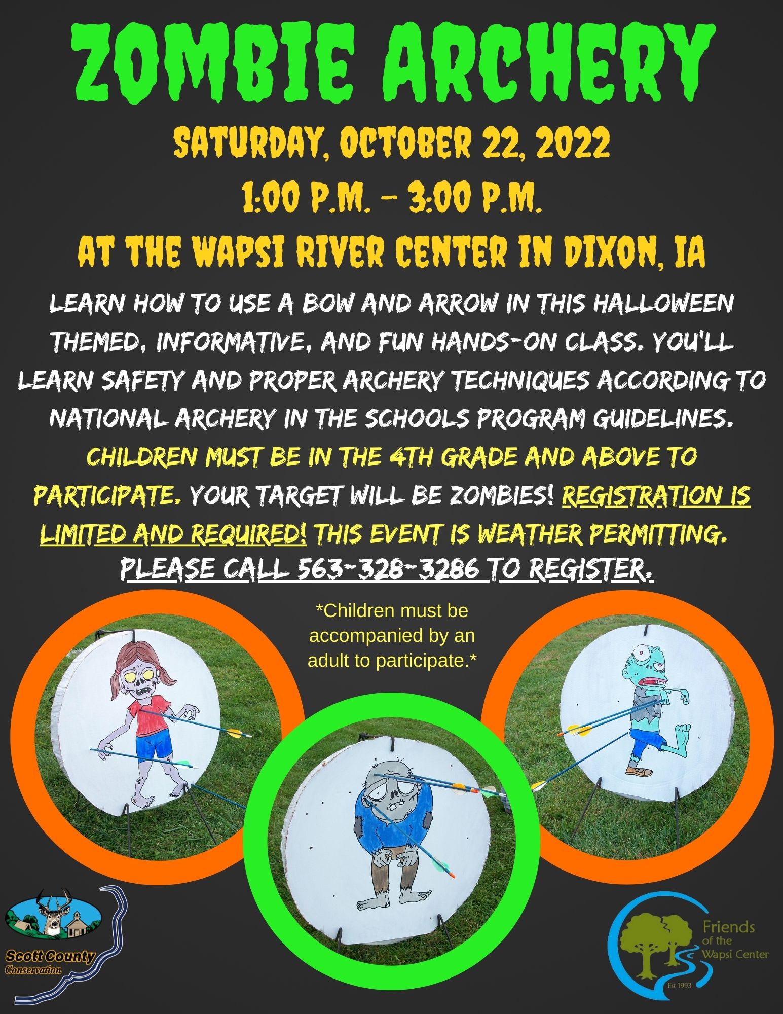 Learn how to use a bow and arrow in this Halloween themed, informative, and fun hands-on class. You’ll learn safety and proper archery techniques according to National Archery in the Schools Program (NASP) guidelines. Children must be in the 4th grade* and above to participate. Your targets will be Zombies! This event is weather permitting.