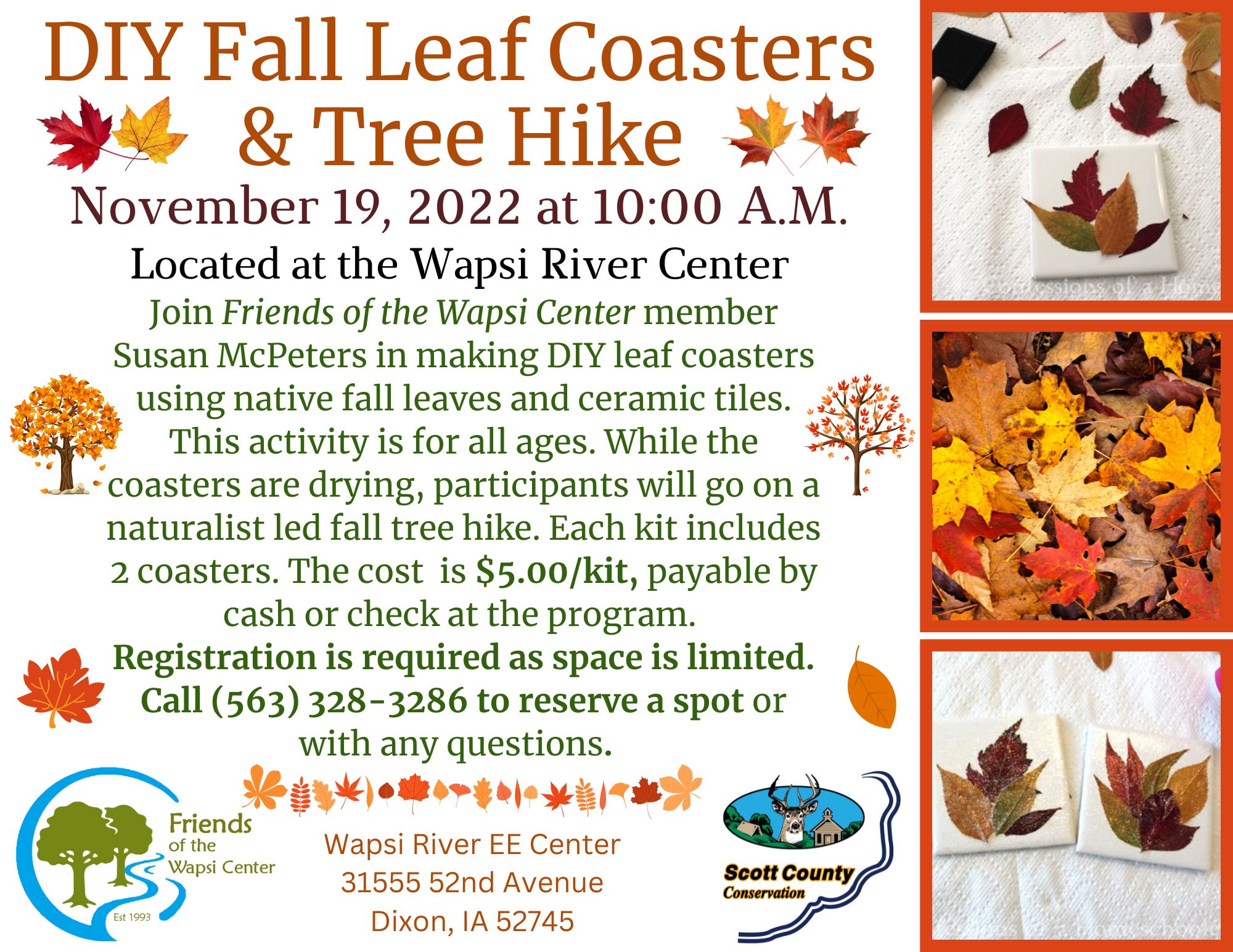 Join Friends of the Wapsi Center member Susan McPeters in making DIY leaf coasters using native fall leaves & ceramic tiles. This activity is for all ages. While the coasters are drying, participants will go on a naturalist led fall tree hike. Each kit includes 2 coasters. The cost is $5.00/kit, payable by cash or check at the program.