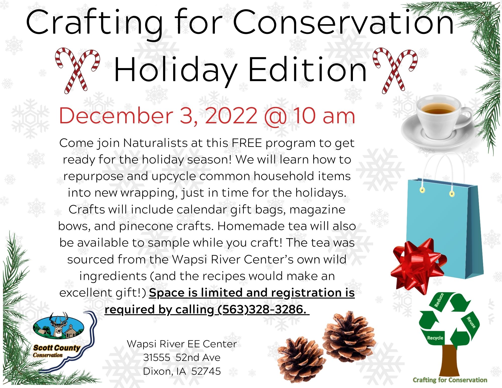 Come join Naturalists at this FREE program to get ready for the holiday season! We will learn how to repurpose and upcycle common household items into new wrapping, just in time for the holidays. Crafts will include calendar gift bags, magazine bows, and pinecone crafts. Homemade tea will also be available to sample while you craft! The tea was sourced from the Wapsi River Center's own wild ingredients (and the recipes would make an excellent gift!)