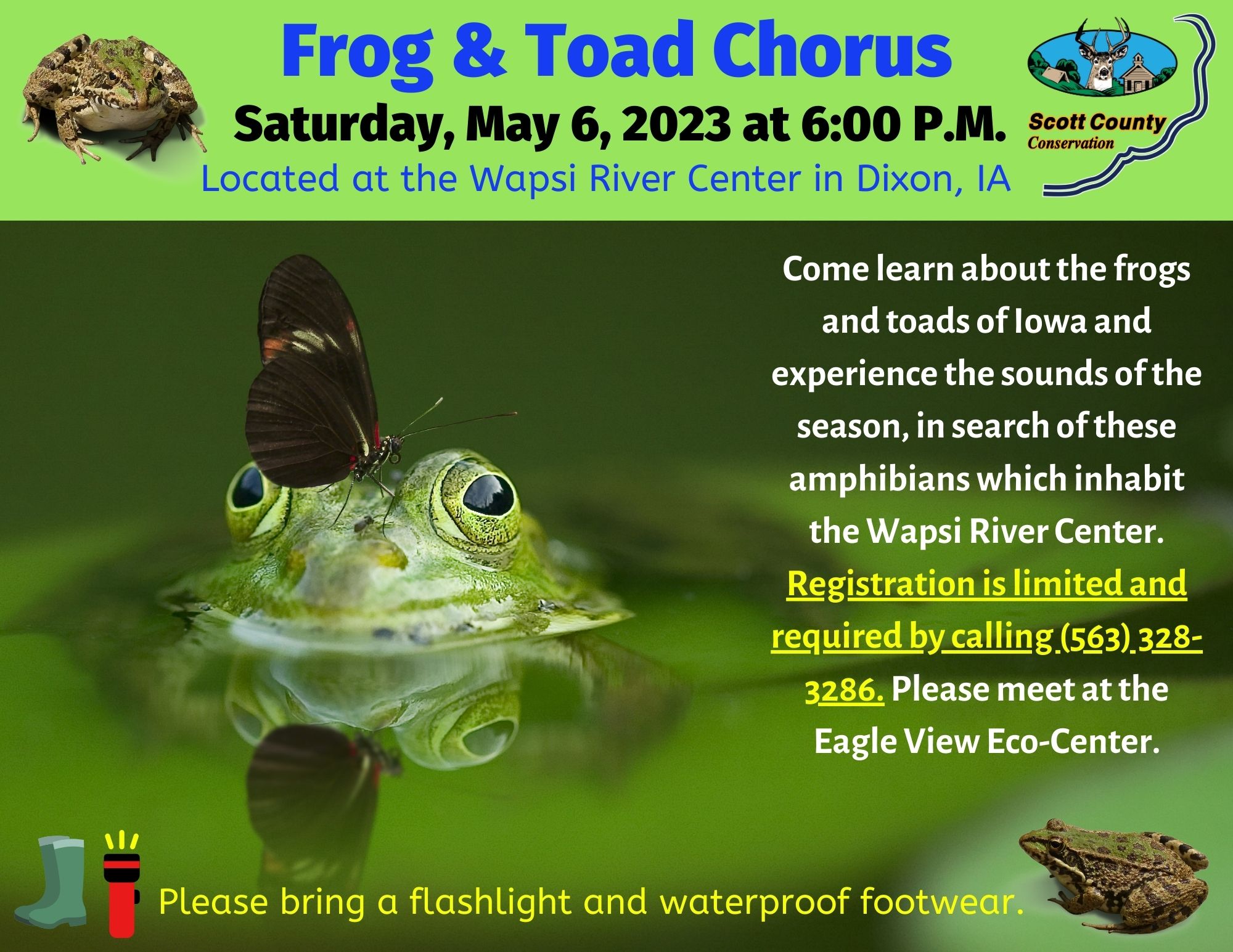Come learn about the frogs and toads of Iowa and experience the sounds of the season, in search of these amphibians which inhabit the Wapsi River Center.