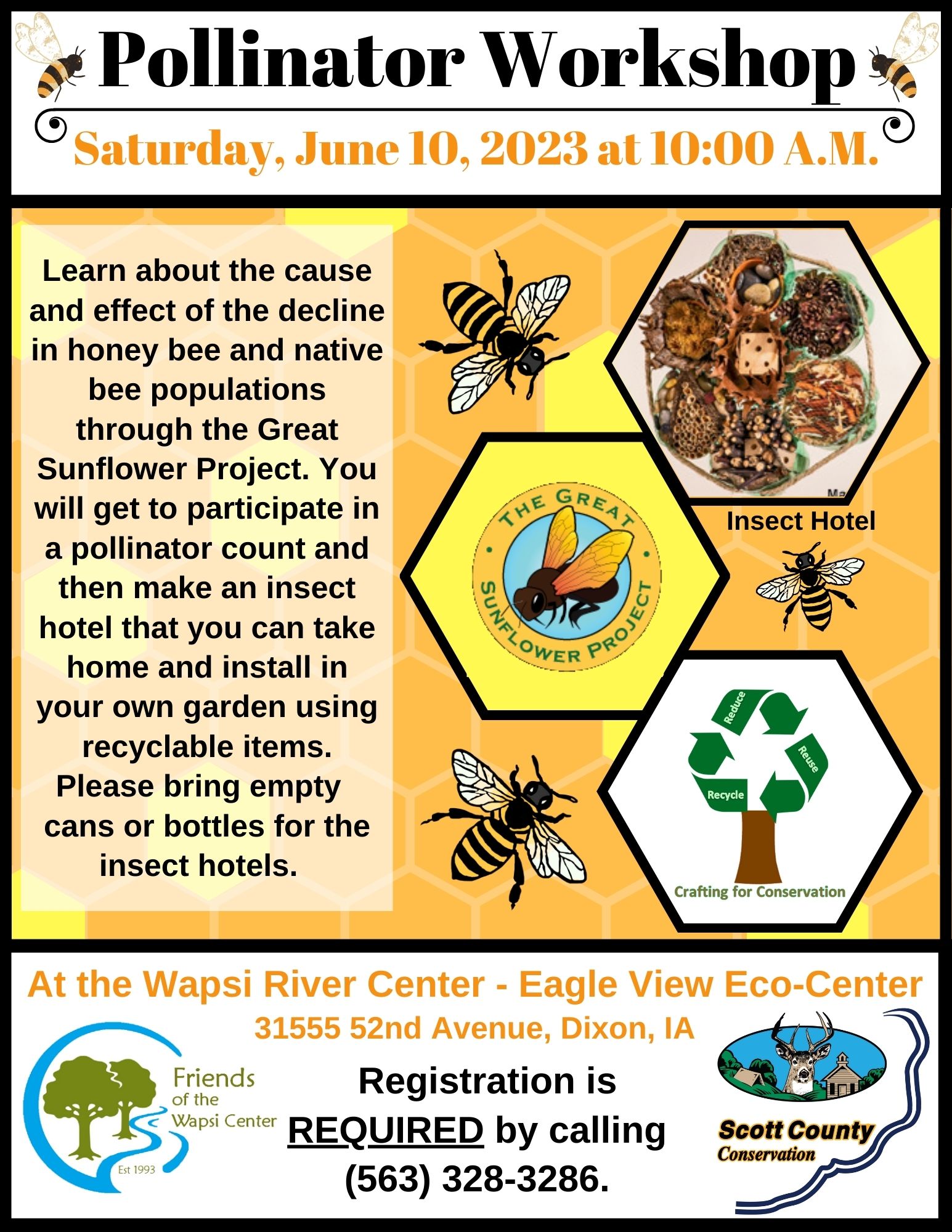 Learn about the cause and effect of the decline in honey bee and native bee populations through the Great Sunflower project . You will get to participate in a pollinator count and then make an insect hotel that you can take home and install in your own garden using recyclable items. Please bring empty cans or bottles for the insect hotels. Registration is REQUIRED. Please call.