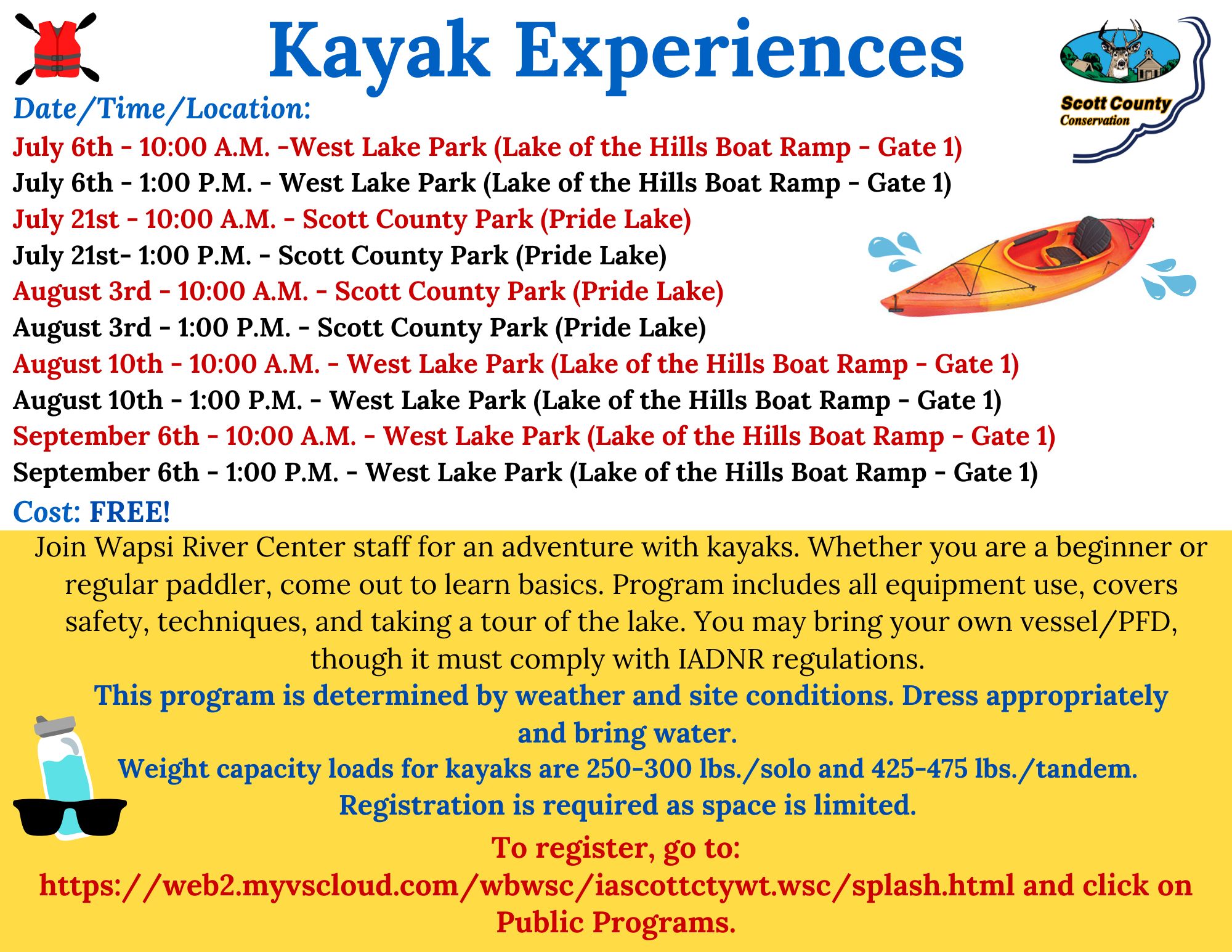 Join Wapsi River Center Staff for an adventure with Kayaks. Whether you are a beginner or a regular paddler, come out to learn basics. Program includes all equipment use, covers safety, techniques, and taking a tour around Lake of the Hills. You may bring your own vessel/PFD, though it must comply with IADNR regulations