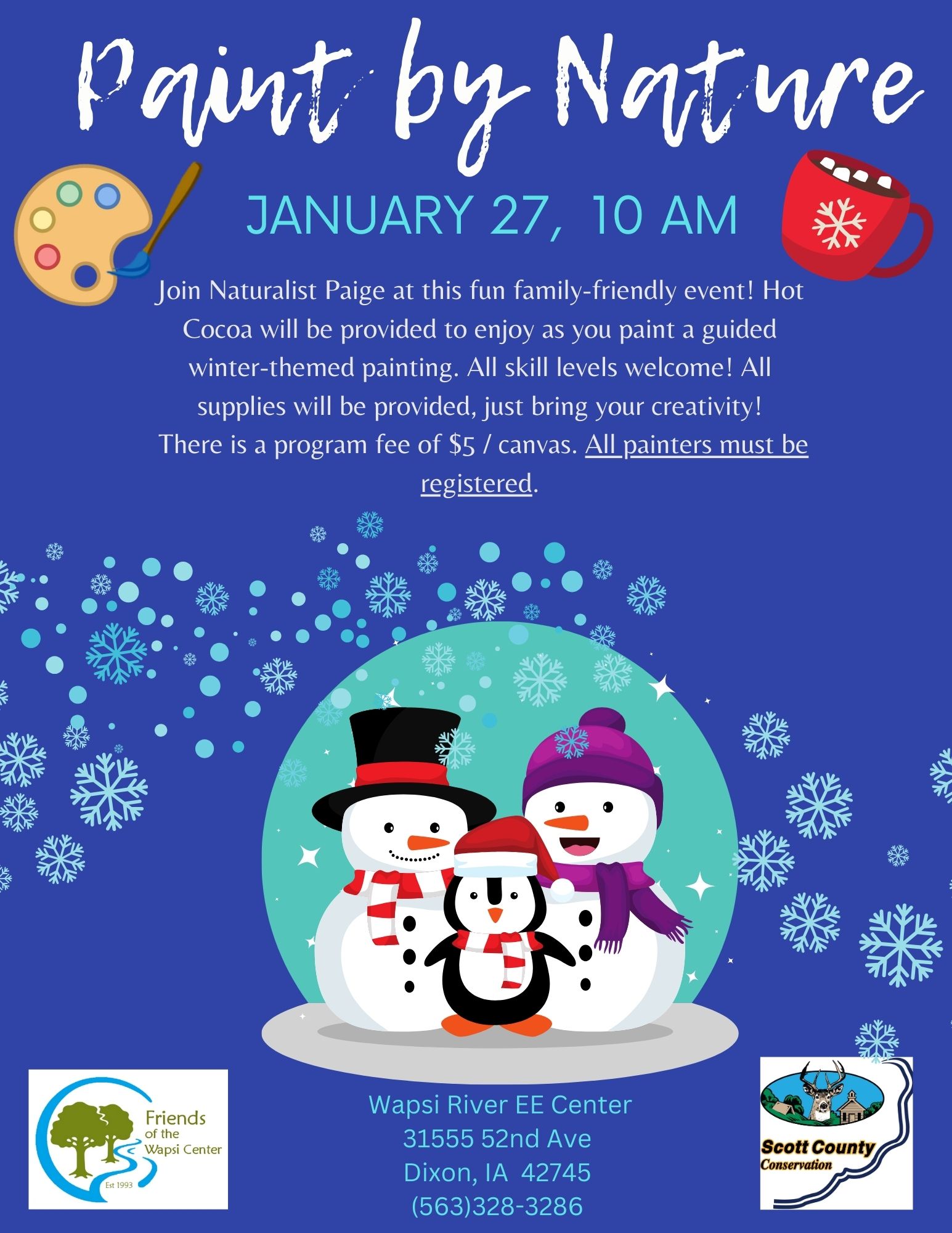 Join Naturalist Paige at this fun family-friendly event! Hot Cocoa will be provided to enjoy as you paint a guided winter-themed painting. All skill levels welcome! all supplies will be provided, just bring your creativity!