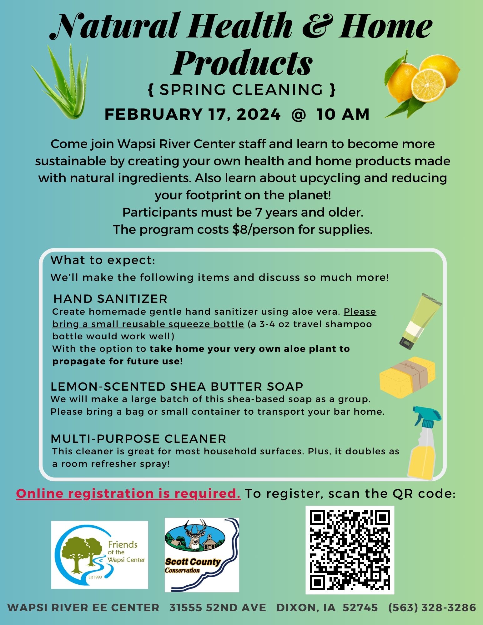 Come join Wapsi River Center staff and learn to become more sustainable by creating your own health and home products made with natural ingredients. Also learn about upcycling and reducing your footprint on the planet.