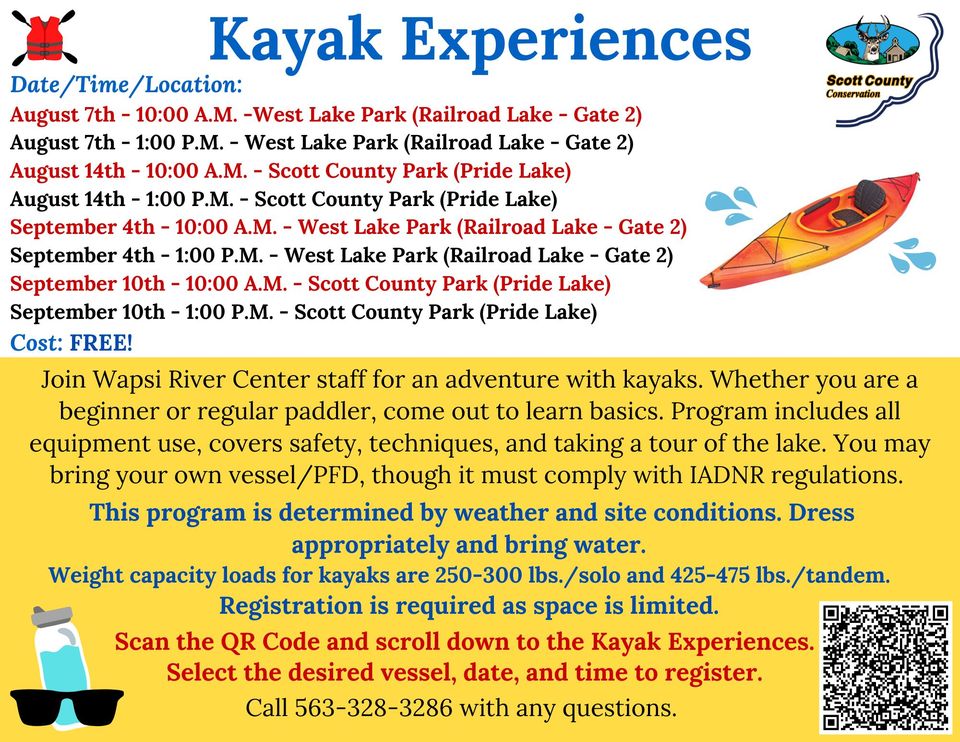 Join Wapsi River Center Staff for an adventure with Kayaks. Whether you are a beginner or a regular paddler, come out to learn basics. Program includes all equipment use, covers safety, techniques, and taking a tour around Lake of the Hills. You may bring your own vessel/PFD, though it must comply with IADNR regulations