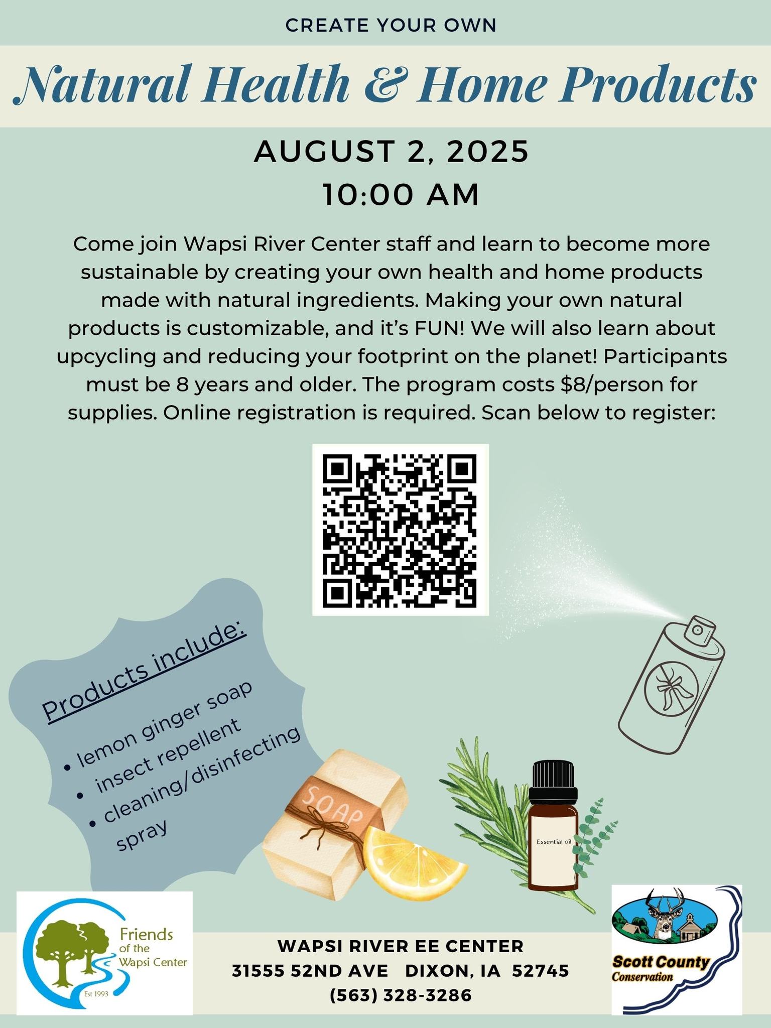 Come join Wapsi River Center staff and learn to become more sustainable by creating your own health and home products made with natural ingredients. Making your own natural products is customizable, and it's FUN! We will also learn about upcycling and reducing your footprint on the planet! Participants must be 8 years and older. The program costs $8//person for supplies.