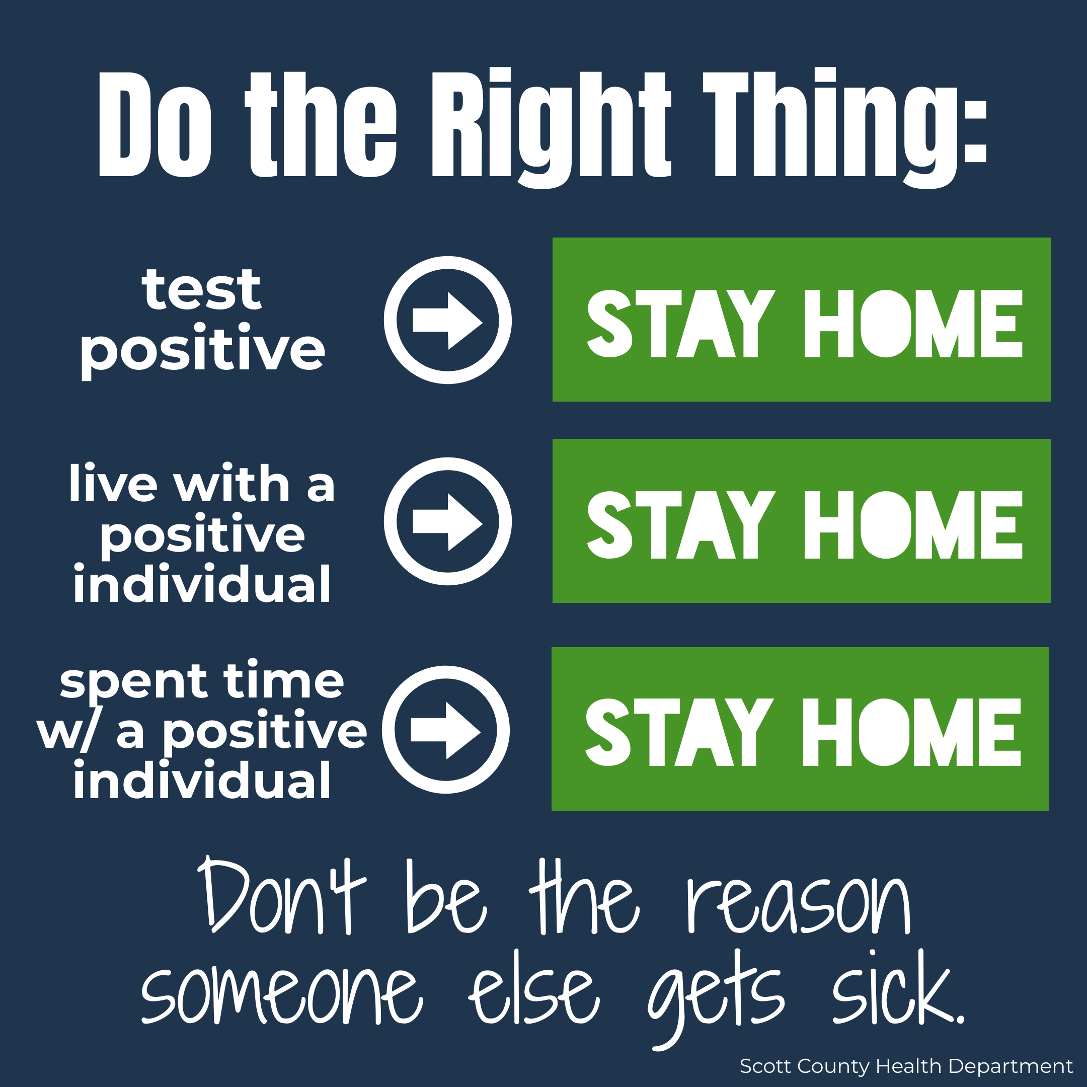 The recent flood of daily positive COVID-19 cases in Scott County is putting significant pressure on our ability to follow-up on all positive cases the same day we get the results. Please know that we WILL follow-up on every positive COVID-19 case we receive. In the meantime, we need your help to slow the spread – even before you hear from us, STAY HOME if: you’ve tested positive, live with someone who tested positive, or have spent time around someone who tested positive.