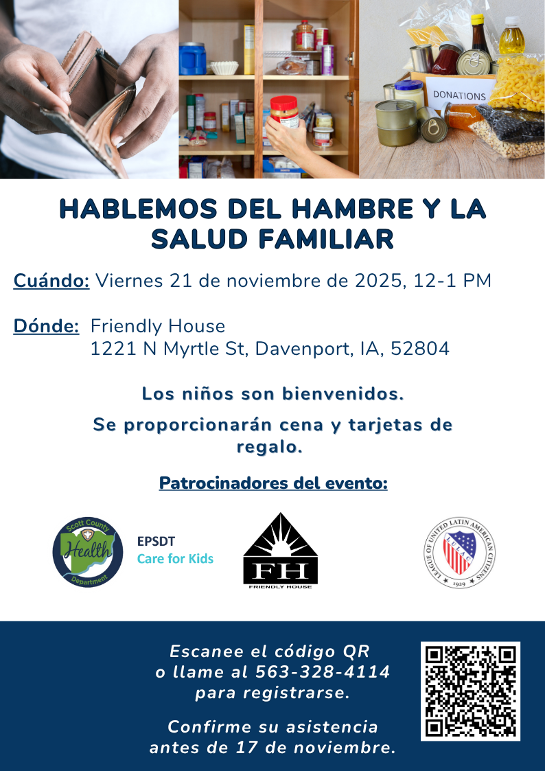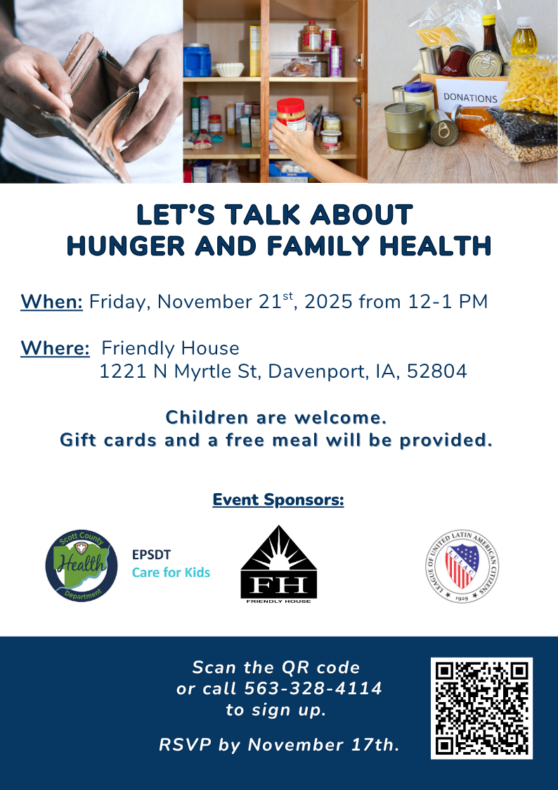 The Scott County Health Department (SCHD) wants to learn from families of all kinds about hunger and how it affects their family. SCHD is partnering with the League of United Latin American Citizens (LULAC) Council 10 and the Friendly House to provide a free event on November 21st where families can talk more about hunger and family health in person. Children are welcome. Gift cards and a free meal will be offered. Event details are listed below: