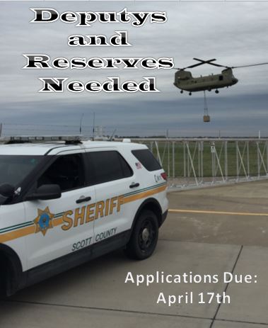 The Scott County Sheriff’s Office is currently taking applications for Deputy and Reserve Deputy. Applications are due April 17th. For a job description or on how to apply please visit us at: https://www.scottcountyiowa.gov/hr