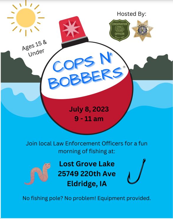 Join Iowa DNR and the Sheriff's Office for Cops n’ Bobbers on July 8th from 9 am - 11 am at Lost Grove Lake! Kids 15 & under can fish with local law enforcement officers. Don’t have a fishing pole? No problem, equipment is provided! See you there!